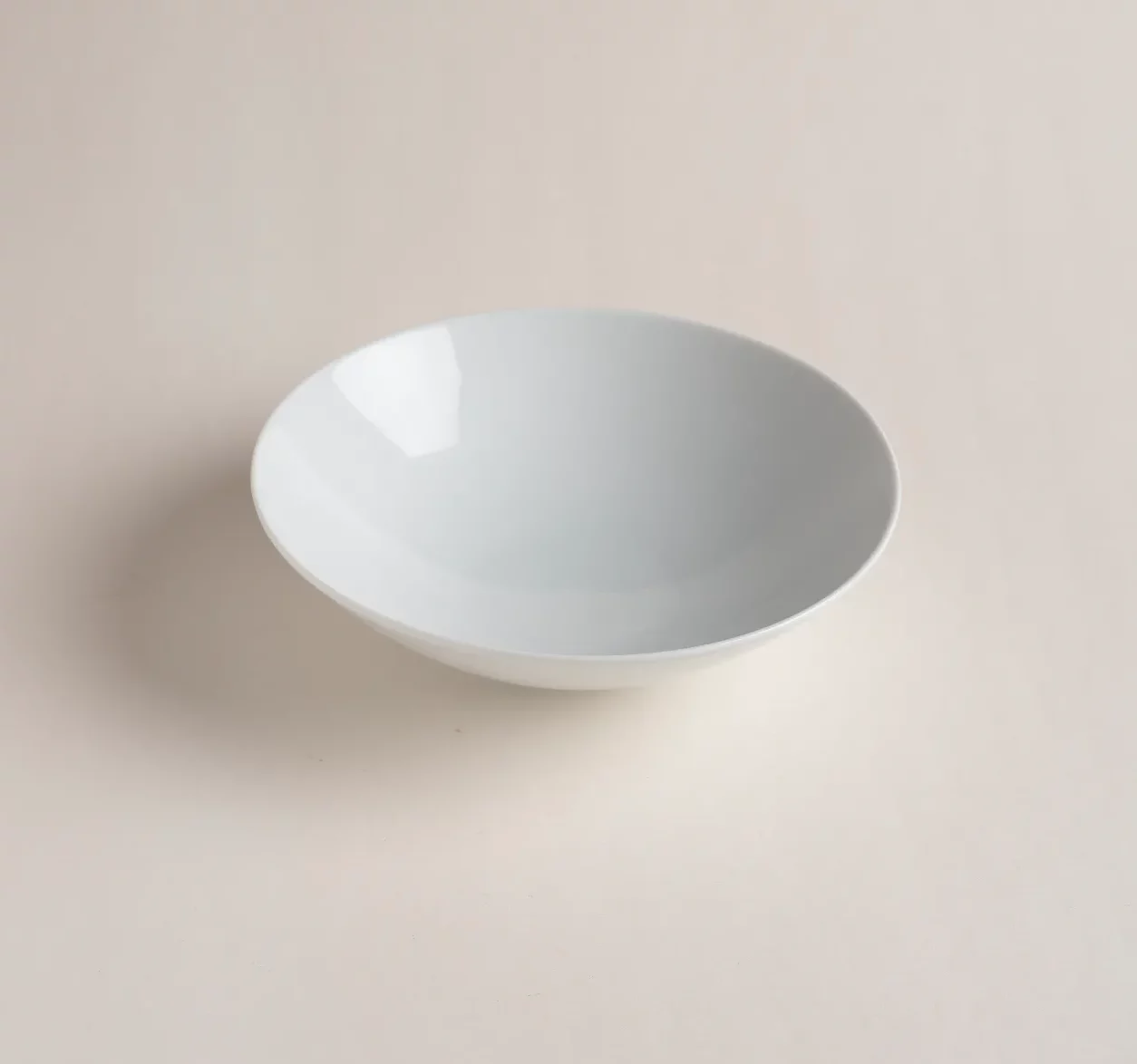 Assiette calotte en porcelaine blanche, au design pur et courbure fluide entre le fond et les bords.
