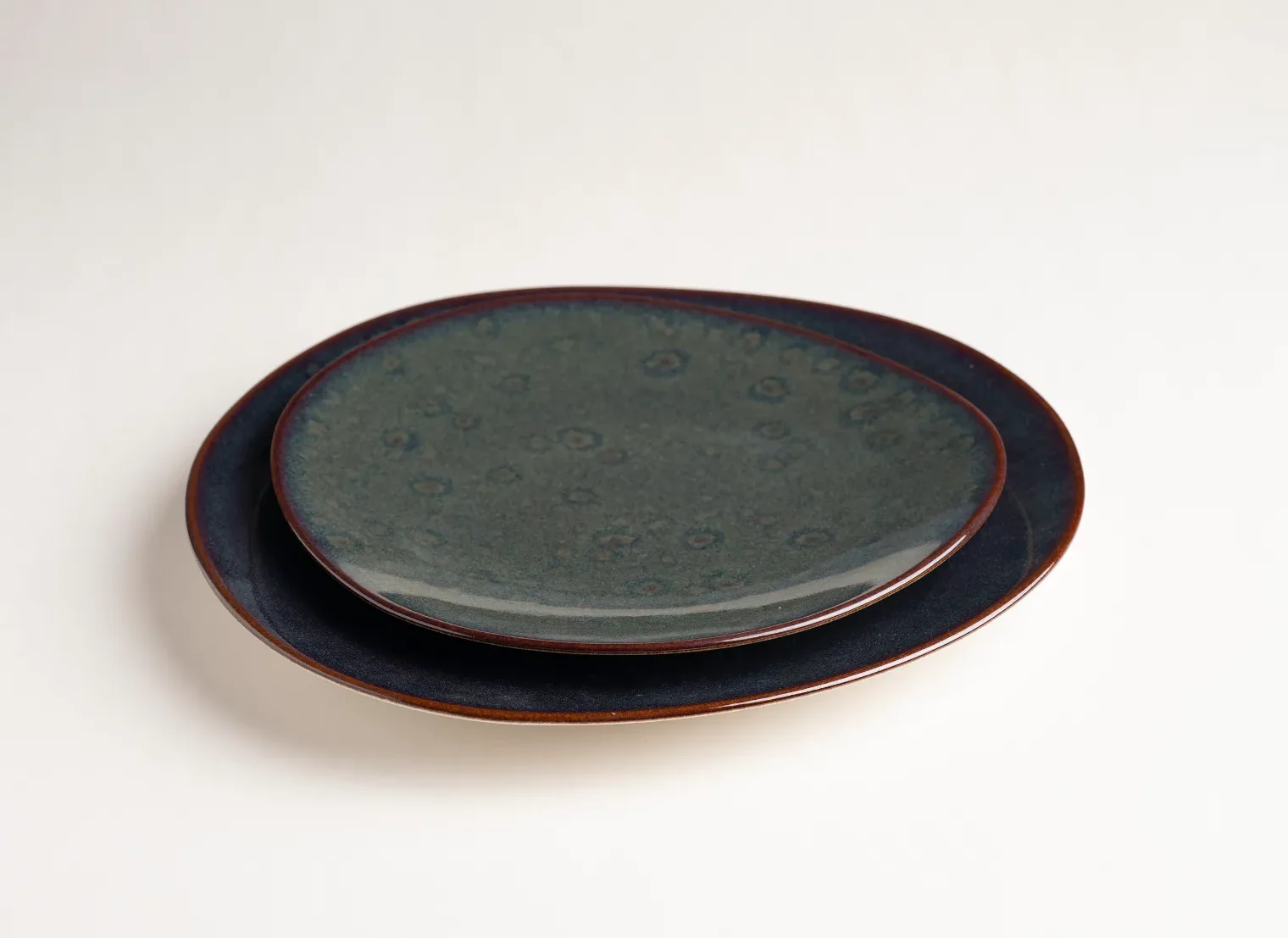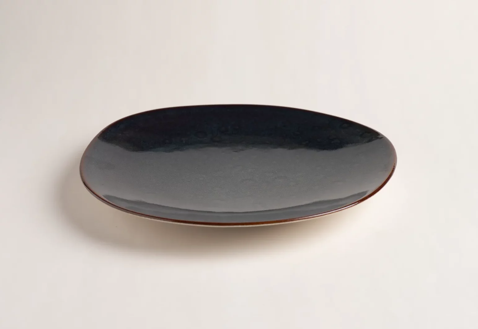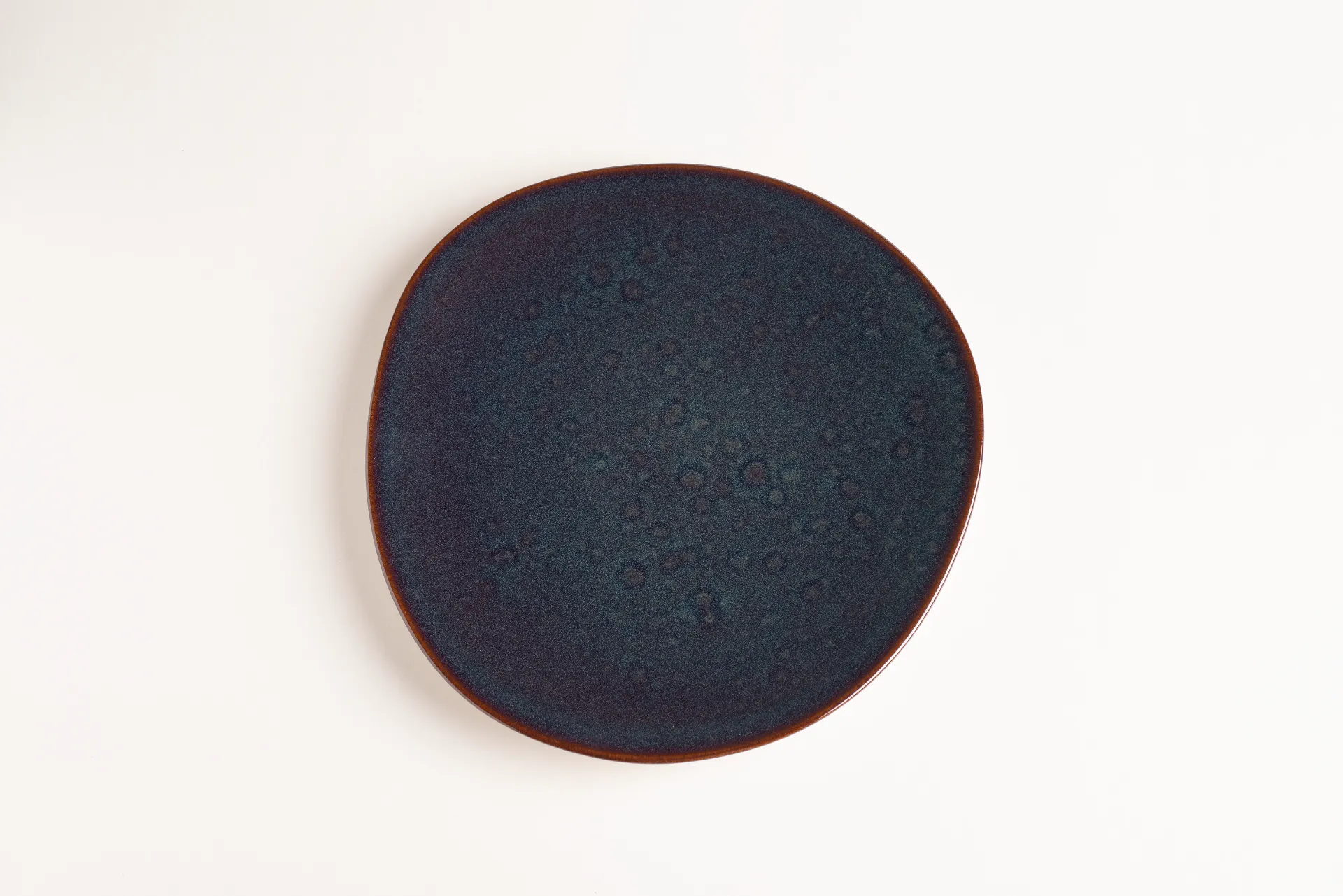 Assiette en grès bleu foncé naturel, soulignée d’une fine lisière rouille qui encadre subtilement la pièce.