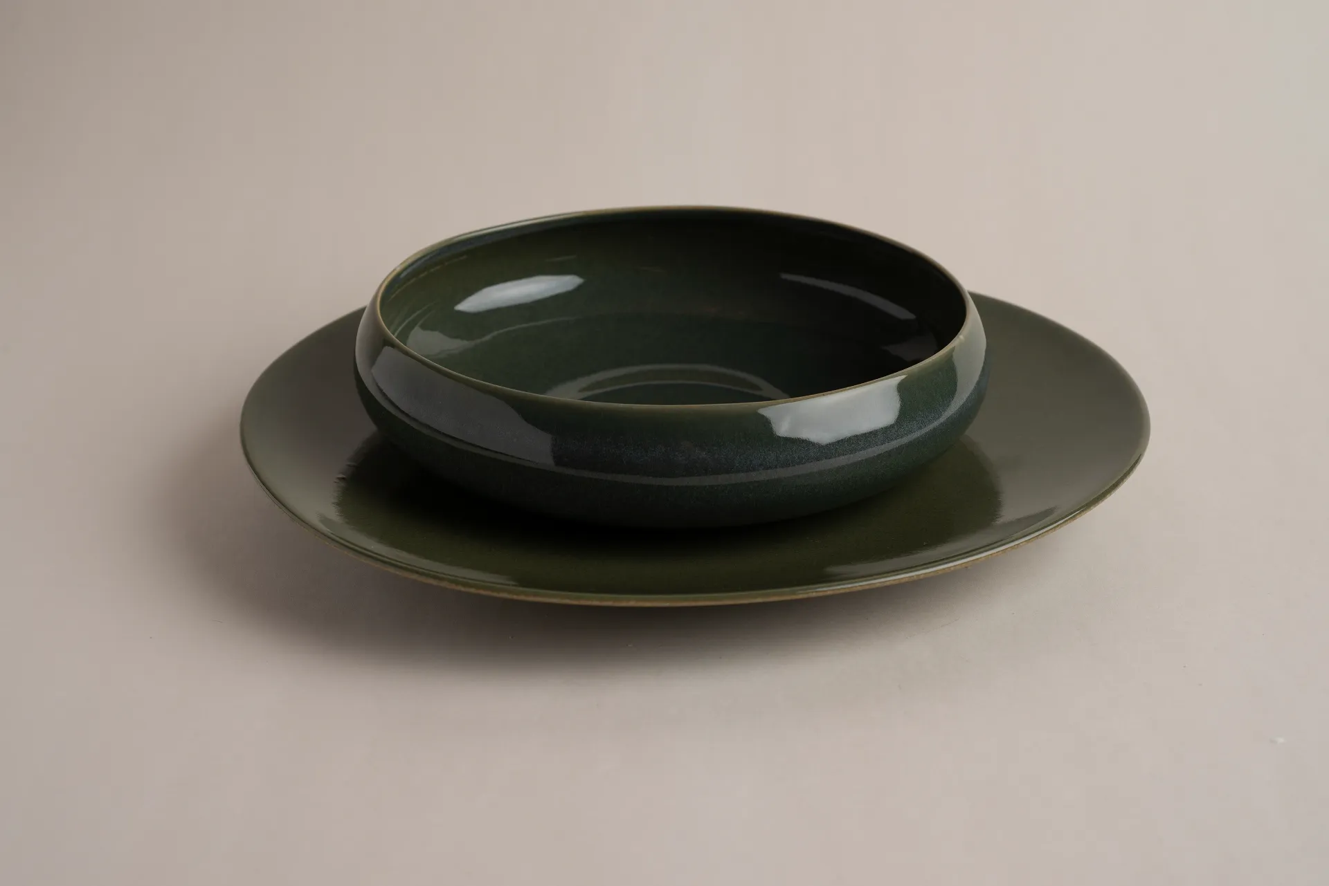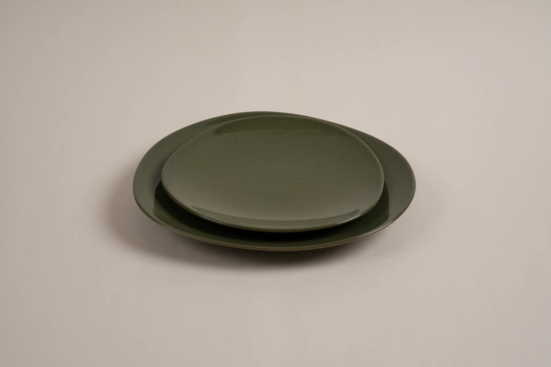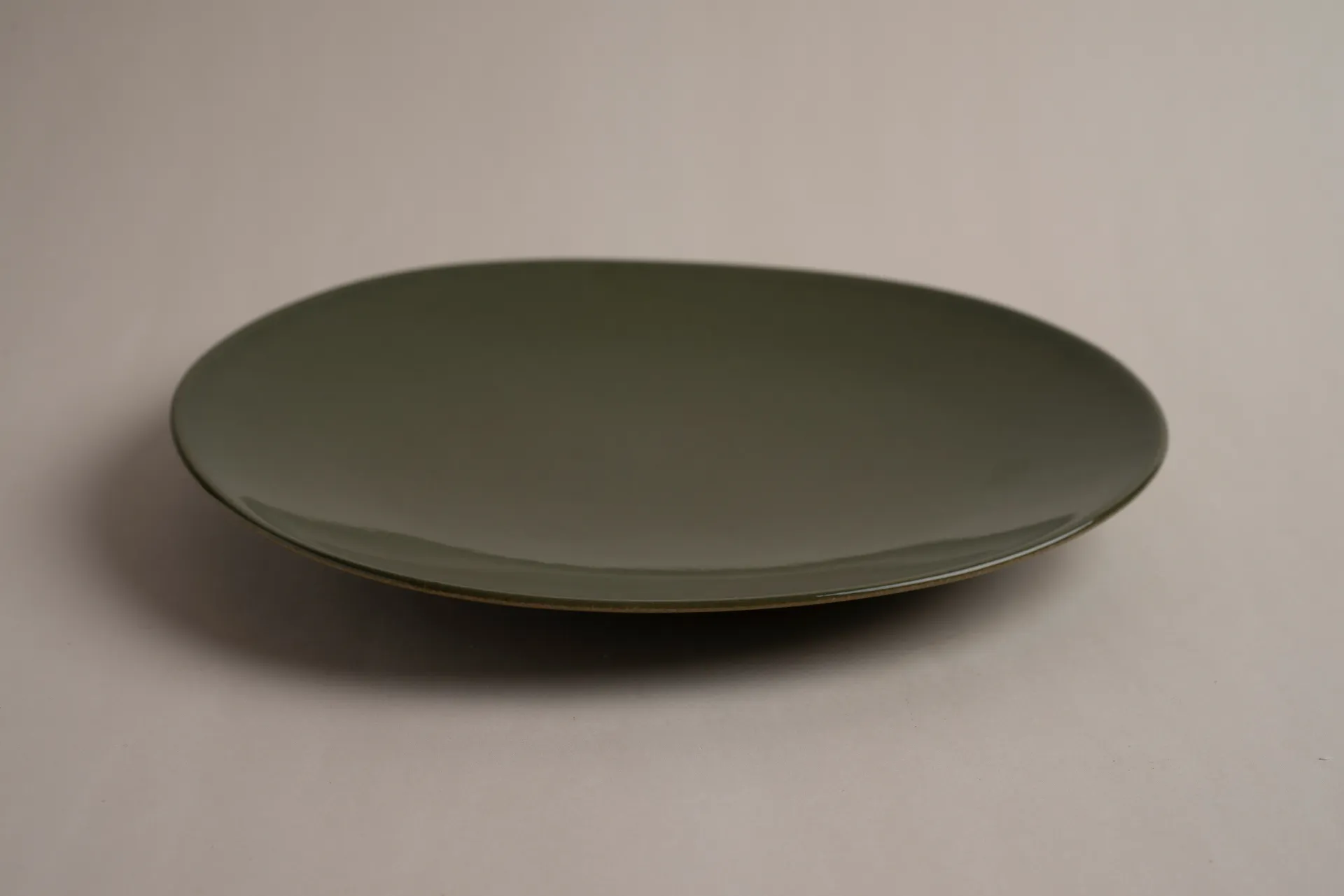 Assiette en grès vert naturel, soulignée d’une fine lisière rouille qui encadre subtilement la pièce.