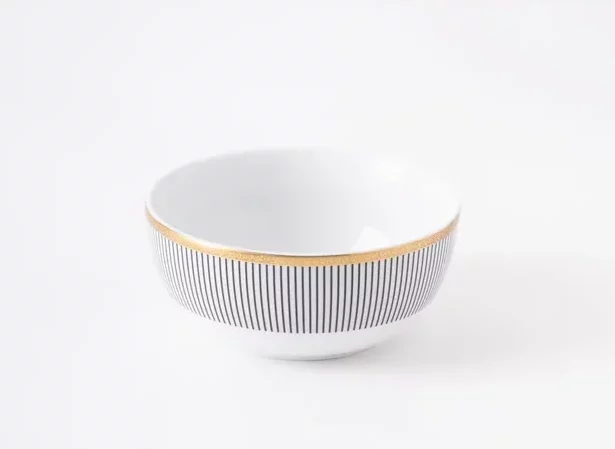 Bol en porcelaine blanche lisse, orné d’un fin liseré doré et d’un décor noir subtil sur le contour.