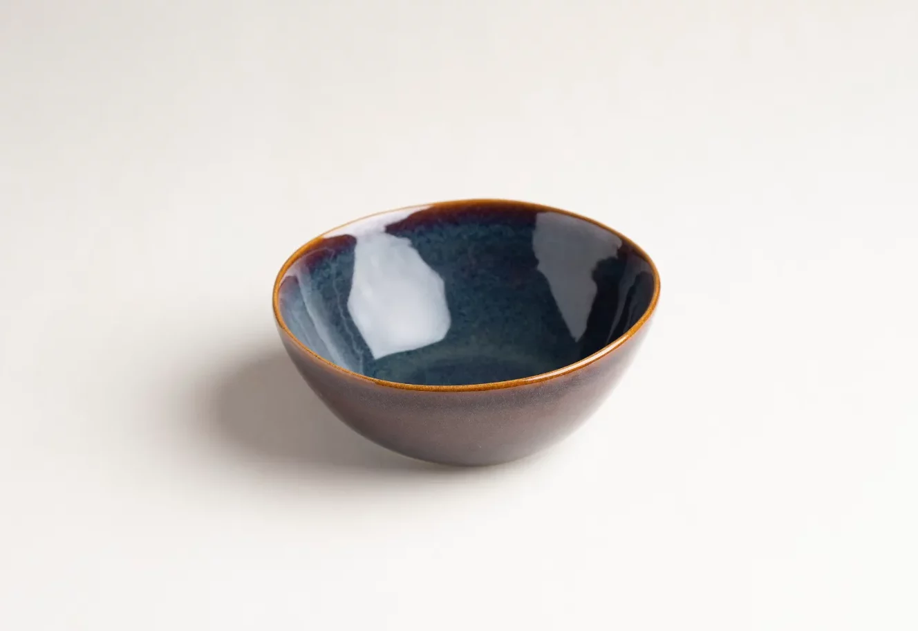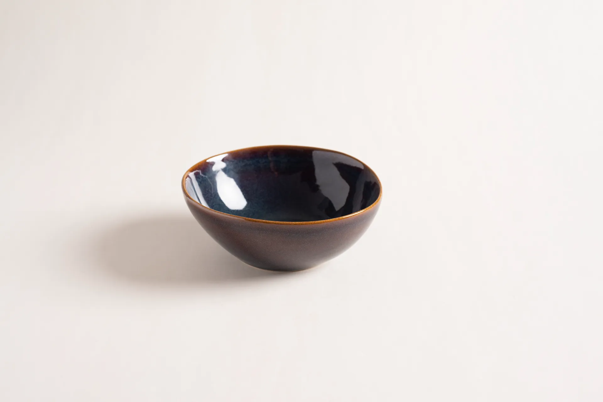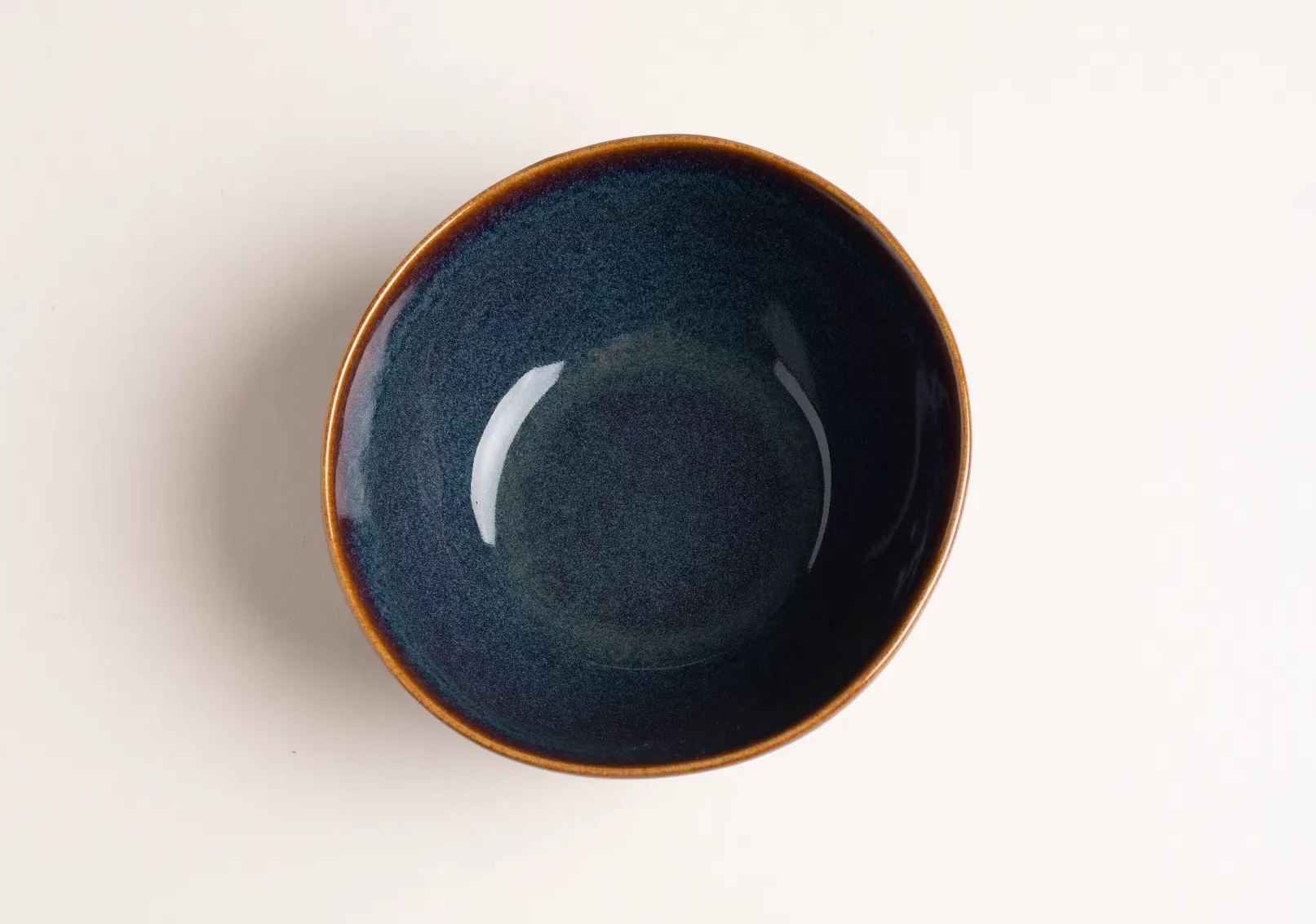 Bol en grès brillant, aux teintes bleu foncé profond évoquant les nuances aquatiques, souligné d’une élégante lisière rouille.