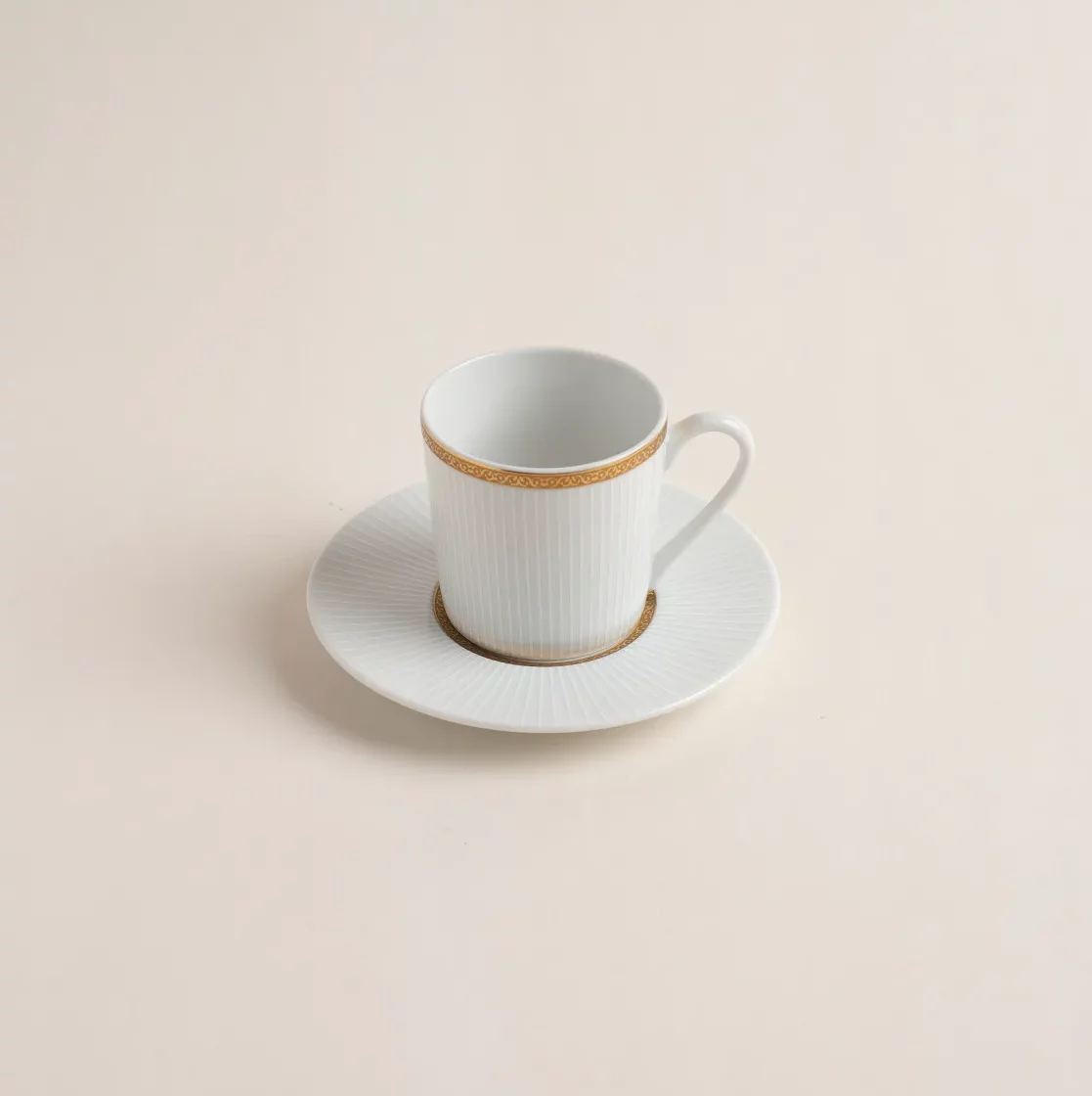 Tasse à café et sous-tasse en porcelaine blanche lisse, décorées d’un délicat filet doré pour une touche d’élégance discrète.