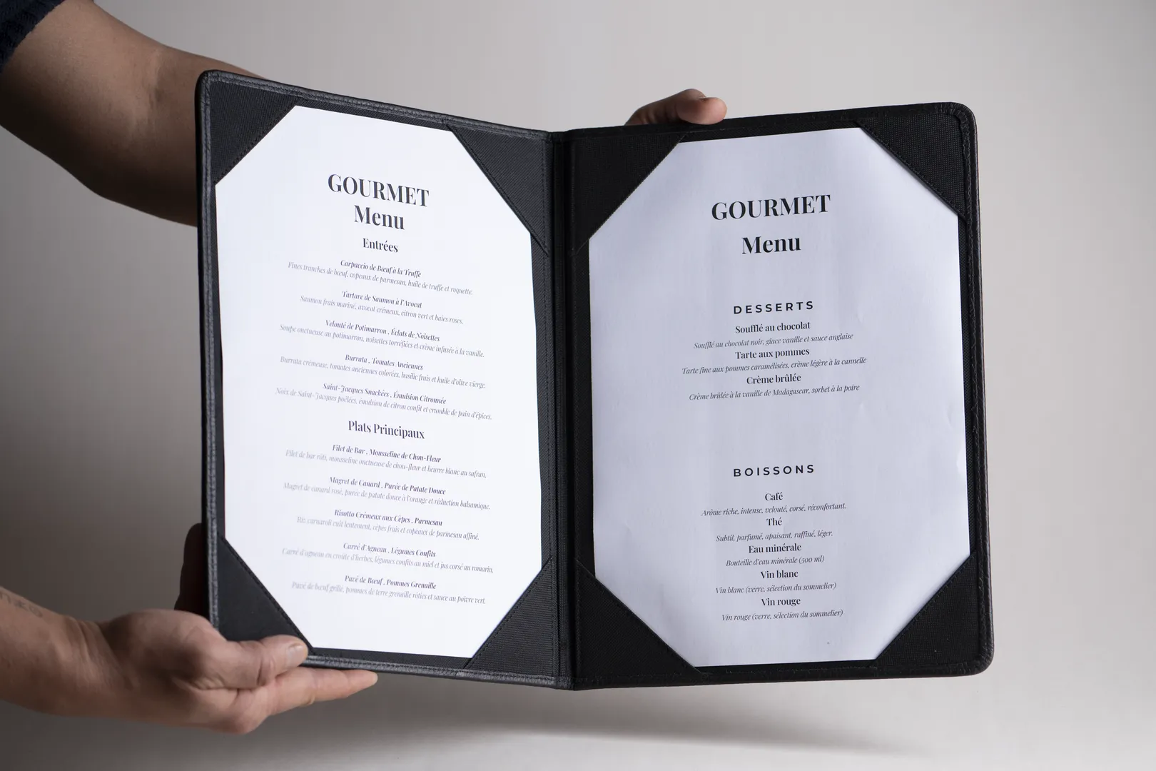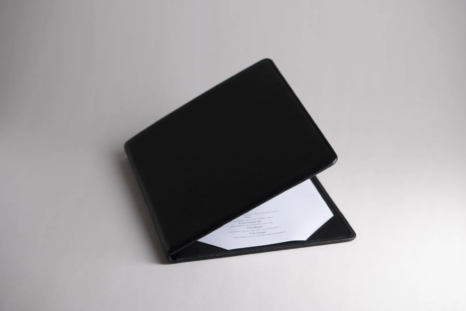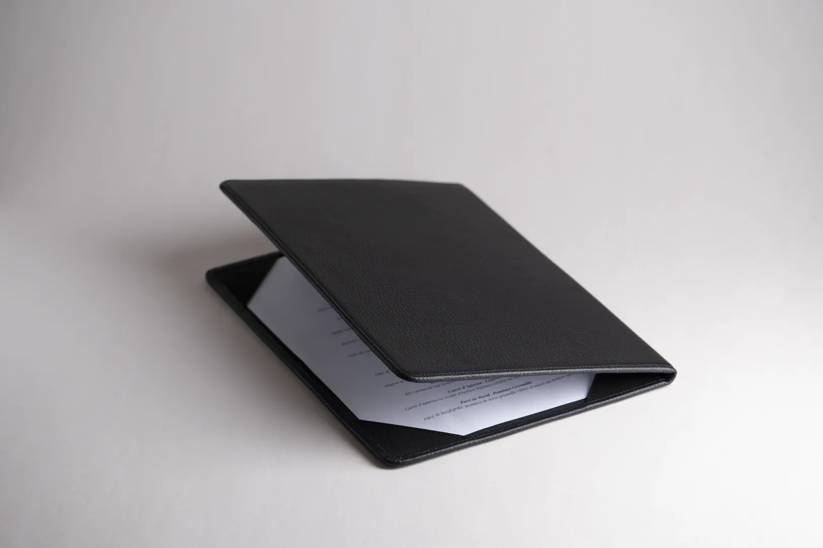Conçu pour les établissements à la recherche d’une présentation élégante et fonctionnelle, ce porte-menu double rigide offre une finition haut de gamme grâce à son cuir de vachette lisse pleine fleur. L’intérieur en feutrine noire visible apporte un contraste raffiné, tandis que l’élastique central permet de maintenir facilement deux feuilles A4 en vis-à-vis. Le renfort cartonné garantit une excellente tenue et une durabilité accrue.