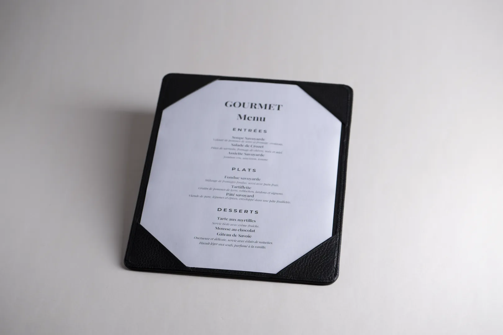 Porte-menu simple rigide Extérieur en cuir de vachette grainé – Intérieur en feutrine noire visible