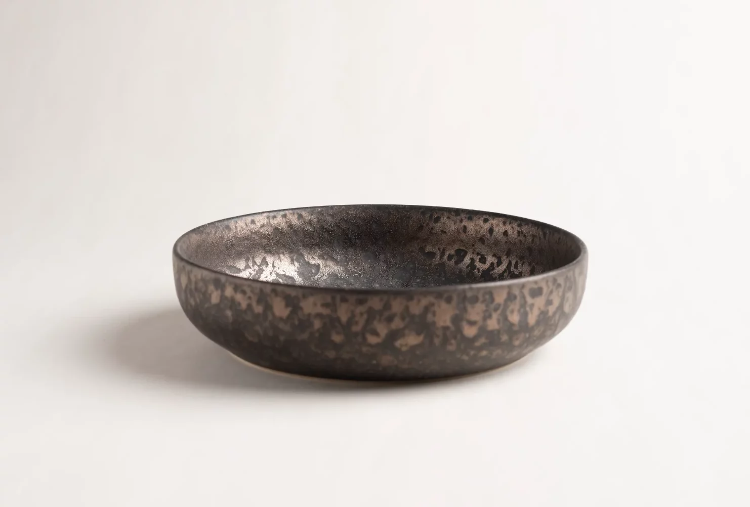 Saladier en grès noir mat, orné d’une finition dorée texturée qui évoque la chaleur minérale et l’élégance minérale naturelle.