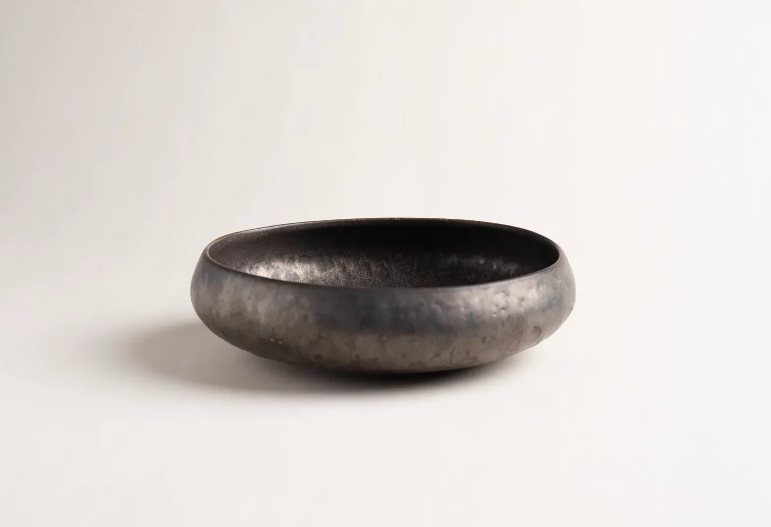Saladier en grès noir mat, orné d’une finition dorée texturée qui évoque la chaleur minérale et l’élégance minérale naturelle.